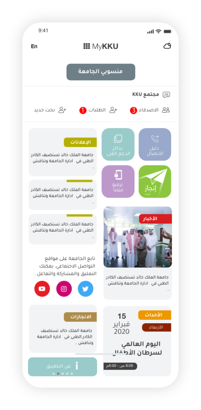وأضاف الصقر أنه تم أيضًا تدشين خدمة النقل الجامعي والتي توفر إمكانية نقل الطلبة وتيسير وصولهم من البيت إلى الجامعة وبالعكس بوسيلة نقل مناسبة تتوافر فيها عناصر السلامة وتسهم الخدمة في الحد من الازدحام المروري وتقليل استهلاك الوقود، والوصول إلى توفير نقل جامعي آمن ومريح وفق أفضل المواصفات في مستويات الخدمة المقدمة، وشملت الخدمات أيضًا خدمة التصاريح وتسمح لمنسوبي الجامعة بطلب تصريح دخول لمنشآت الجامعة خارج أوقات العمل الرسمية وتشمل إظهار تصاريح الدخول الحالية وإظهار تصاريح الدخول السابقة وطلب تصريح دخول وعرض تصريح الدخول داخل تطبيق MyKKU.
